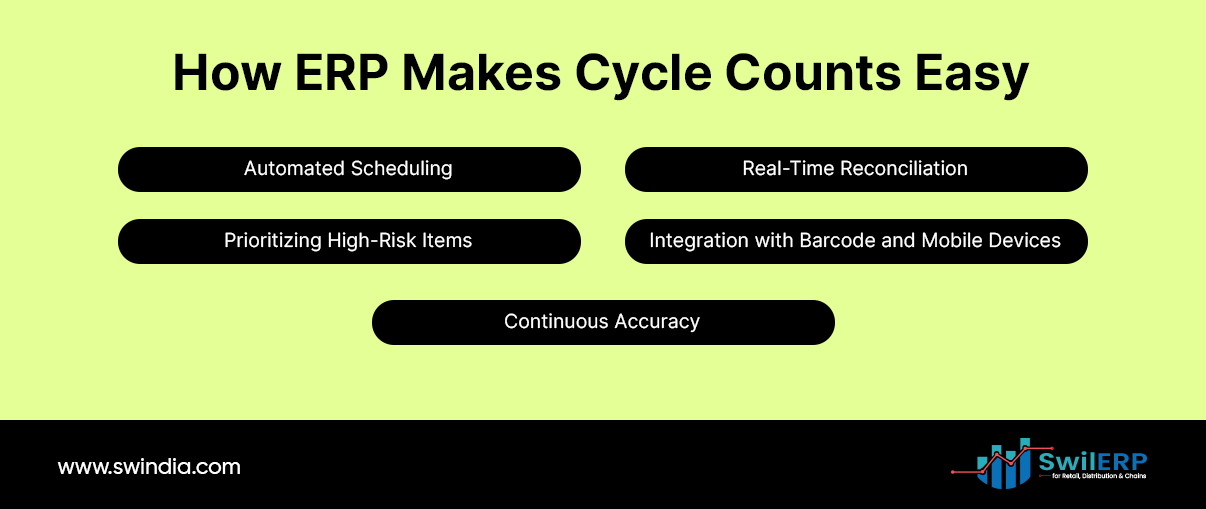ERP supports barcode scanning and mobile apps for counting, which speeds up the process and reduces manual entry errors.